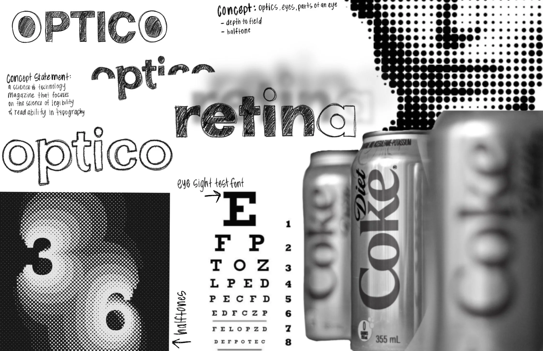 Exploration of many different sans-serif typefaces to effectively portray the concept statement, and the design and typographic attributes.