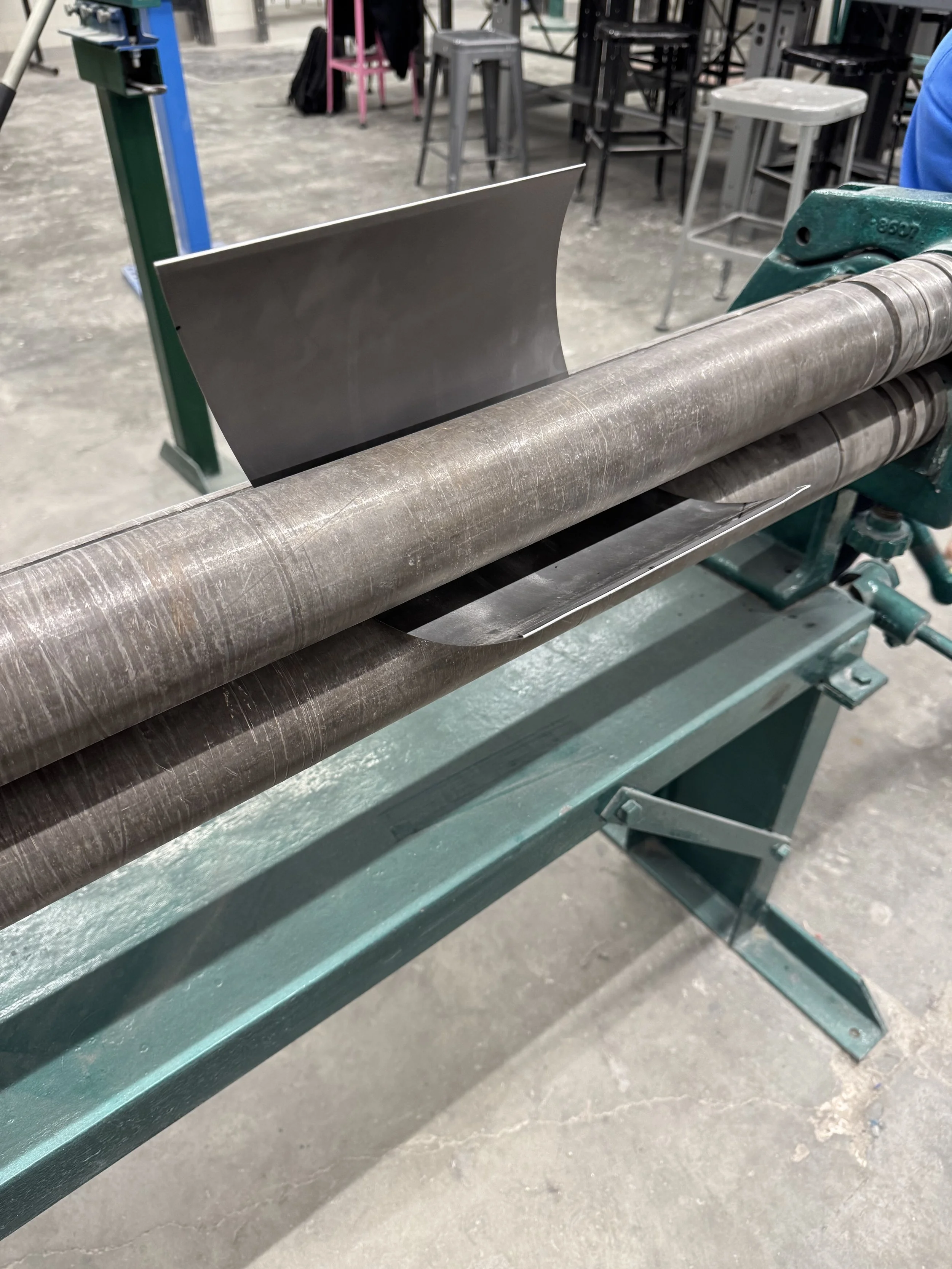 The graphic was printed on vinyl adhesive, then places on a rolled sheet of metal. Each was connected by another rolled sheet of metal that was perforated, spray painted and Cricut cut lettering.